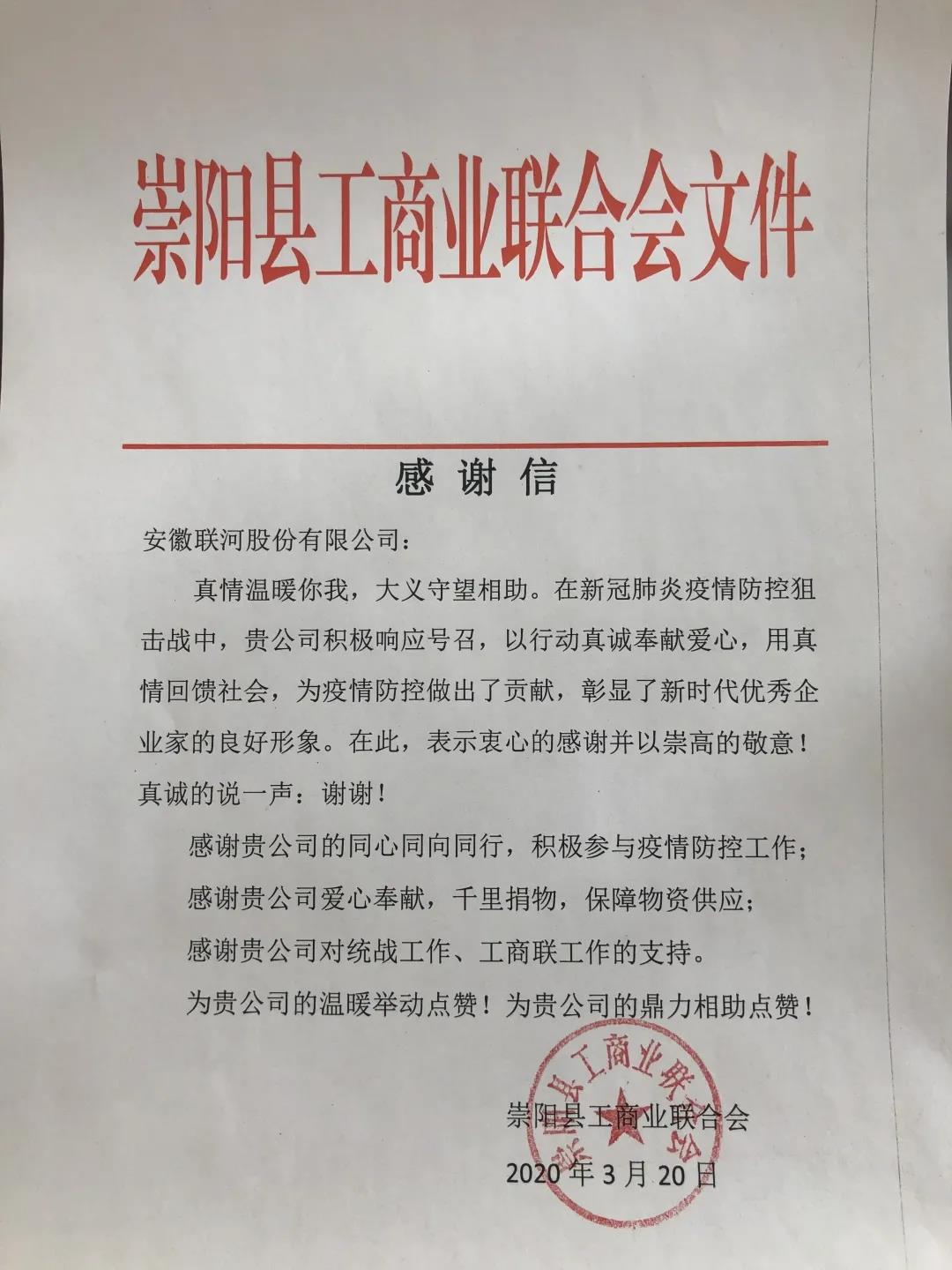 近日,公司收到來自湖北省咸寧市崇陽(yáng)縣工商業(yè)聯(lián)合會(huì)發(fā)來的感謝信及縣紅十字會(huì)授予的捐贈(zèng)證書,感謝聯(lián)河的暖心相助。
