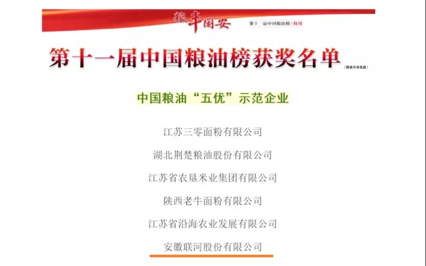 11月16日“第十一屆中國糧油榜單”強勢出爐,安徽聯河股份有限公司榮膺“中國糧油‘五優’示范企業”。